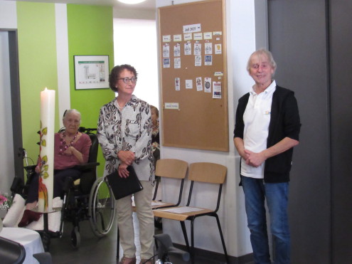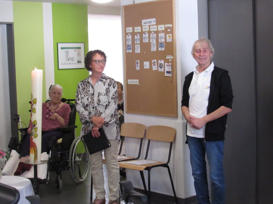 Das Foto zeigt Renate Hoffmann-Kalkofen von der katholischen Kirchengemeinde Der gute Hirte und DAHEIM-Geschäftsführer Anton Lechinger nach dem Gottesdienst.